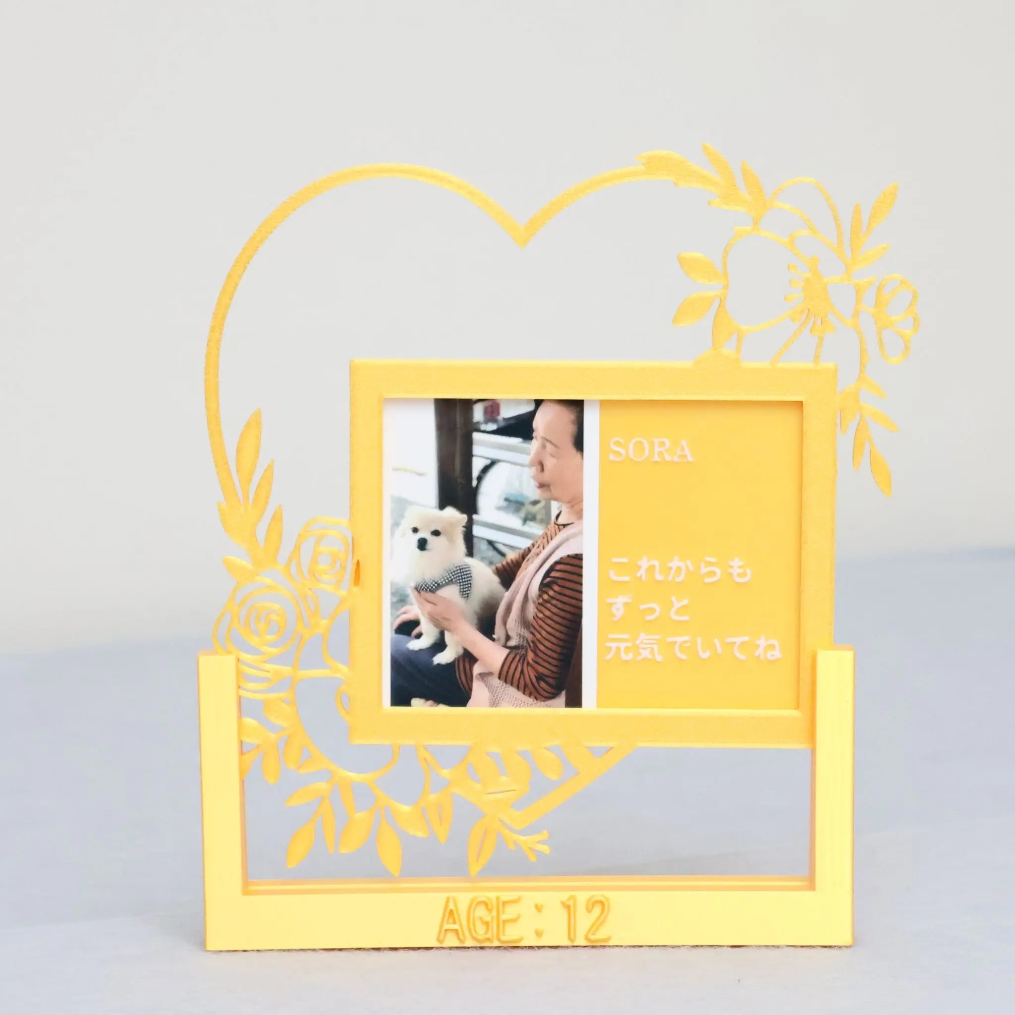 ペットの写真て、子供と一緒で何歳になっても尊いと思えますよね。そして、実家が田舎なのであまり成長写真を贈れていなかったのですが、フォトフレームを作ってもらえたので子供と一緒に写真を贈ってあげたところ、非常に喜んでくれました。